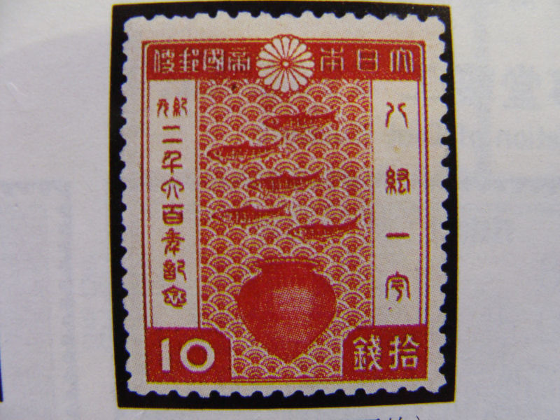 見ての通り、それは真っ赤な色で印刷された10銭切手で、同年2月11日に発行されたものであるが、「紀元二千六百年記念」・「八紘一宇」・「大日本帝國郵便」などの文字に囲まれた中央に、厳?*と魚とが描かれている。「其ノ意匠ハ(中略)戊午年九月丹生之川ニ於ケル故事ニ因ミ嚴?*ト魚トヲ描キ靜海波ヲ配シ」たと、『紀元二千六百年祝典記録』第17巻には記録されている[荒井(編),2002:p.289]。厳?*はまるで縄文早期の尖底土器のごとくに底の尖った、床に置けない不思議な形状の甕で、こんな形をしていたのだなと、今筆者らは感慨を持つけれども、この原図を描いた絵師にしたところで、『日本書紀』の時代の人ではもちろんないし、想像で描いているに過ぎない。宗教史研究家の宮井義雄氏によればこの厳?*は、弥生式土器から土師器への移行期の焼き物であるという[荒井(編),2002:p.289]。そして、その厳?*の上方には、酔っ払って川面にプカプカと浮かび上がったという5匹の魚が描かれている。魚類学の権威であった末広恭雄博士によれば、これをアユであるとし、アユであるにもかかわらず、背鰭と尾鰭との間にあるべき脂鰭(あぶらびれ)が描かれていないのはおかしいと、図柄の誤りを指摘しておられるのであった[末広,1964:pp.16-17]。